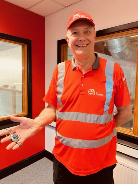 Glenn is pictured with his son Josh who also works for the business and also pictured holding his retirement gift from the business & the staff at David Smith.